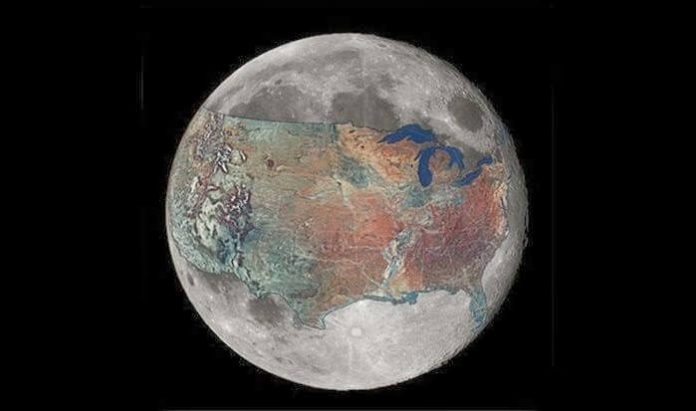 18. This map shows how much space the United States would occupy on the moon.