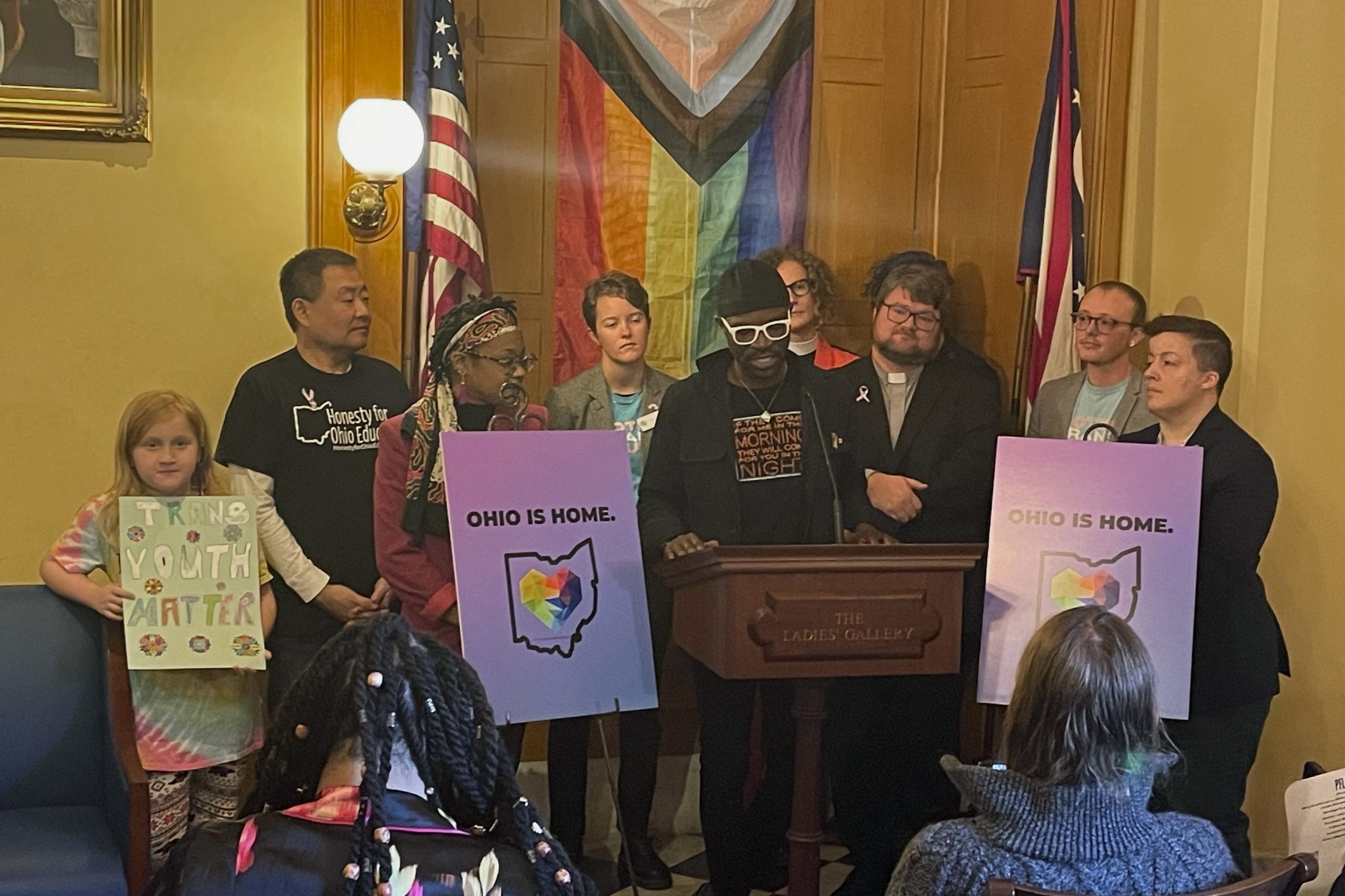 Organizers including clergy, business owners, social workers and transgender individuals gather in the Ohio Statehouse for a press conference on Wednesday, Dec. 13, 2023 in Columbus, Ohio in opposition to a bill that would ban gender affirming care for minors and ban transgender athletes from participating in girls’ and women’s sports. The Ohio Republican-led state Senate cleared the measure along party lines Wednesday. (AP Photo/Samantha Hendrickson)